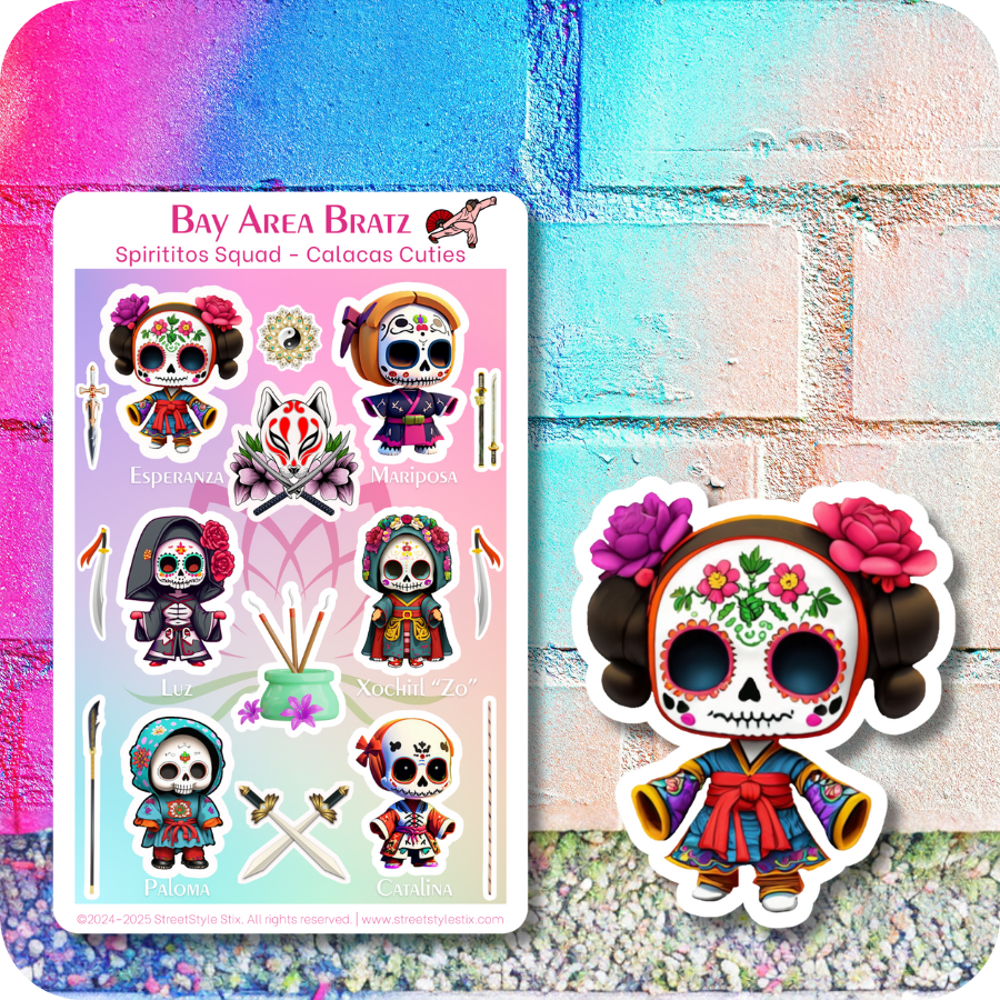 Part of the Bay Area Bratz series, this sticker sheet is a colorful tribute to cultural pride, resilience, and community spirit. Whether you’re into lucha legends, street fashion, or unique characters that pack a punch, the Calacas Cuties are ready to rumble—with style!